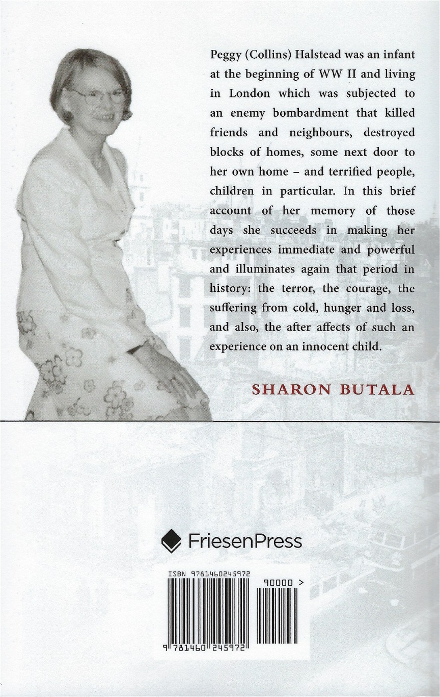 MEET PEGGY HALSTEADIn “TEDDY ‘N’ ME, The Blitz and other Childhood War Memories” she shares her childhood memories. After the war, she, like thousands of other children of the war tried to get on with life as best as they could. She completed secondary school, worked for the Bank of England and then British Overseas Airways Corporation known, in jest, amongst the staff as (Better On A Camel). In 1963 she immigrated to Canada for a one year work term and 51 years later she is still there, married to David, mother of Neal and Sara, Nana to Nathaniel, Melissa, Anja, Isaac and Eden. She has 16 years experience as an elected public school trustee in two cities.