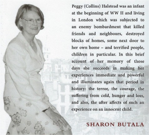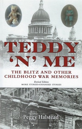 MEET PEGGY HALSTEADIn “TEDDY ‘N’ ME, The Blitz and other Childhood War Memories” she shares her childhood memories. After the war, she, like thousands of other children of the war tried to get on with life as best as they could. She completed secondary school, worked for the Bank of England and then British Overseas Airways Corporation known, in jest, amongst the staff as (Better On A Camel). In 1963 she immigrated to Canada for a one year work term and 51 years later she is still there, married to David, mother of Neal and Sara, Nana to Nathaniel, Melissa, Anja, Isaac and Eden. She has 16 years experience as an elected public school trustee in two cities.